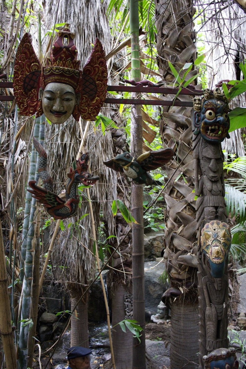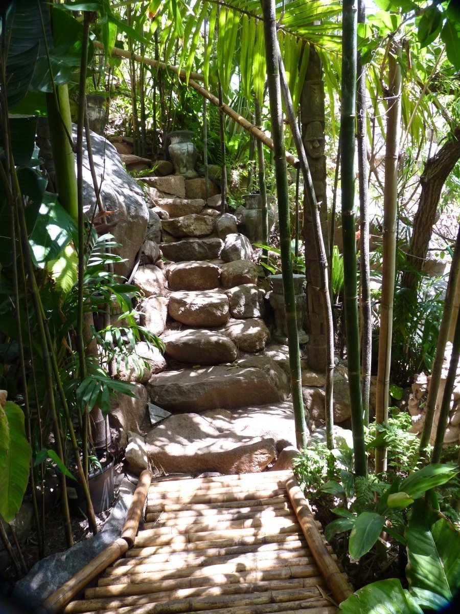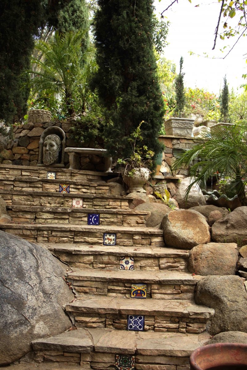 Their garden allows visitors to meander along a main path of cobblestones, bamboo and dirt, with side paths that branch out from it leading lead to several distinct “lands.” The different lands pay tribute to different areas around the globe, and honor different times and eras as well — from Mayan/Aztec culture to the African plateaus to Greco-Roman to Polynesia and event prehistoric days of dinosaurs.