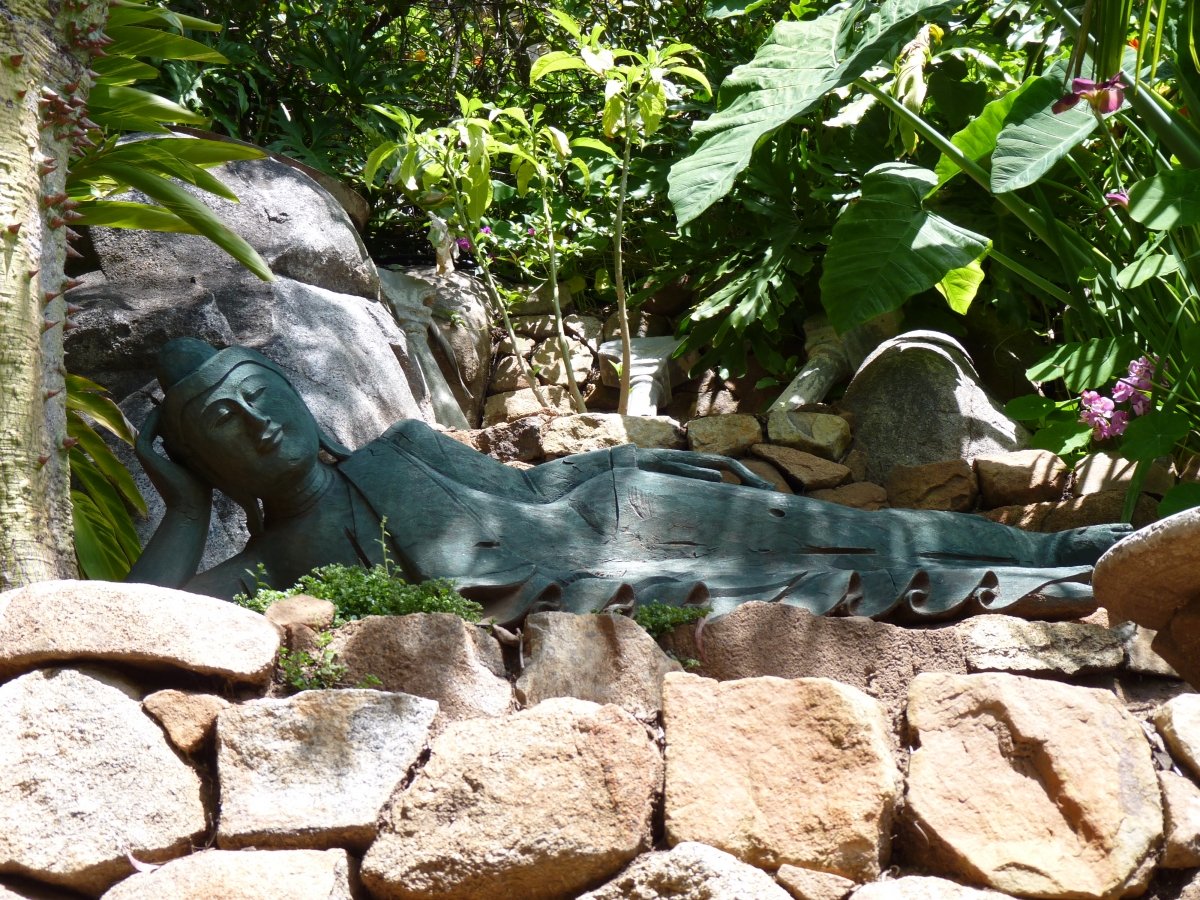 he garden is dotted with hundreds of figurines and statues — including gnomes, a group of brassy-looking giraffes, Buddha likenesses, lion heads, a stoic black panther, a Sphinx and other fantastical and fun statues and figures, all inviting you to explore your imagination.