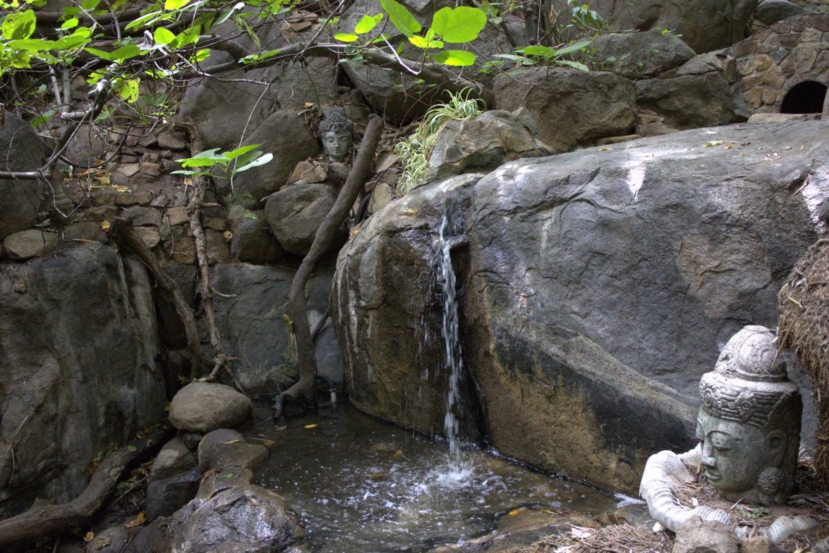 Small details as you walk along the path are worth seeking out — like different types and styles of artwork carved or painted on stones – some of which Bob Caparas has done himself, including a petroglyph of a feather serpent god. There’s even an homage to Stonehenge. Bannisters help guests keep their balance in some spots, where things are a little steep.