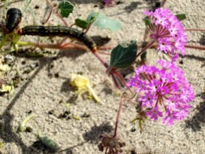 Printer-friendly version March 12, 2015 (Anza Borrego Desert) – Kristin Kjaero visited the Anza Borrego desert Tuesday, where she observed “thousands of caterpillars in a feeding frenzy…The roads were dotted with yellow splotches.” Standing still for just a few moments to take a photo, she adds, “I had caterpillars crawl onto each foot.” After munching on the flower fields,