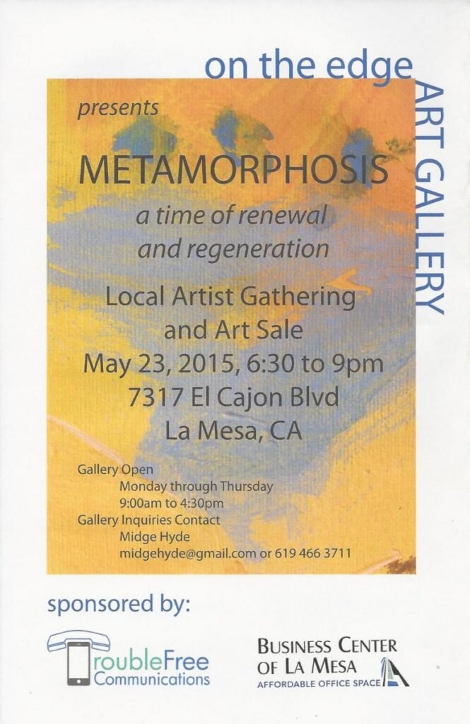 April 17, 2015 (La Mesa) –On the Edge Art Gallery invites the public to Metamorphosis: a time of renewal and regeneration. This local artists’ gathering and art sale will be held on May 23 from 6:30 to 9 p.m.