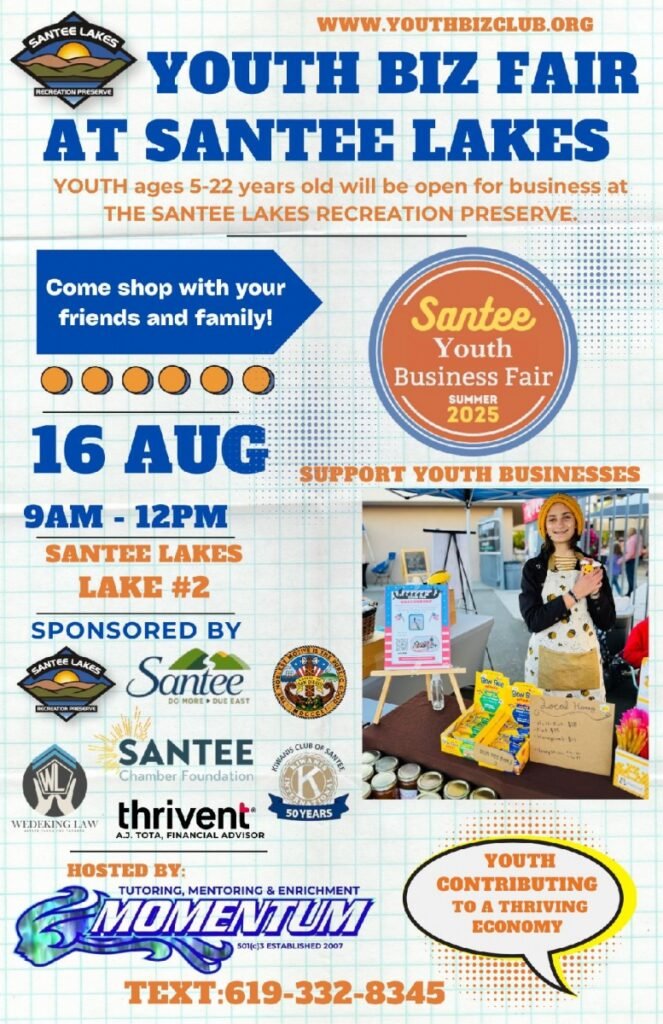 August 12, 2025 (Santee) – Momentum Tutoring (www.momentumtutoring.org) invites the community to the Santee Youth Business Fair at Santee Lakes, a dynamic one-day marketplace where young entrepreneurs will showcase their creativity, hustle, and heart. The event takes place on Saturday, August 16, 2025, from 9:00 a.m. to 12:00 p.m. at Lake #2, Santee Lakes Recreation Preserve.