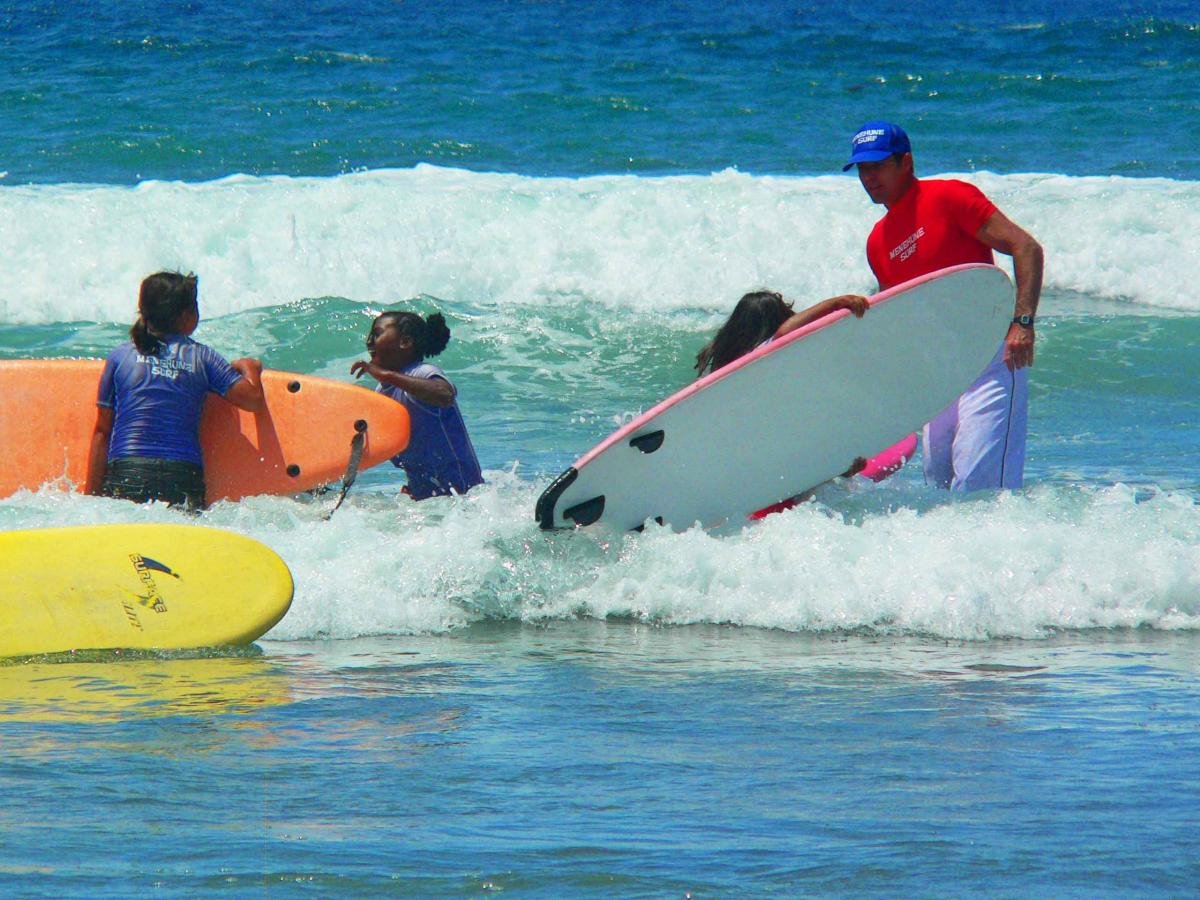 Next, students lay down on the sand, then pop up, learning basic paddling and surfing techniques.