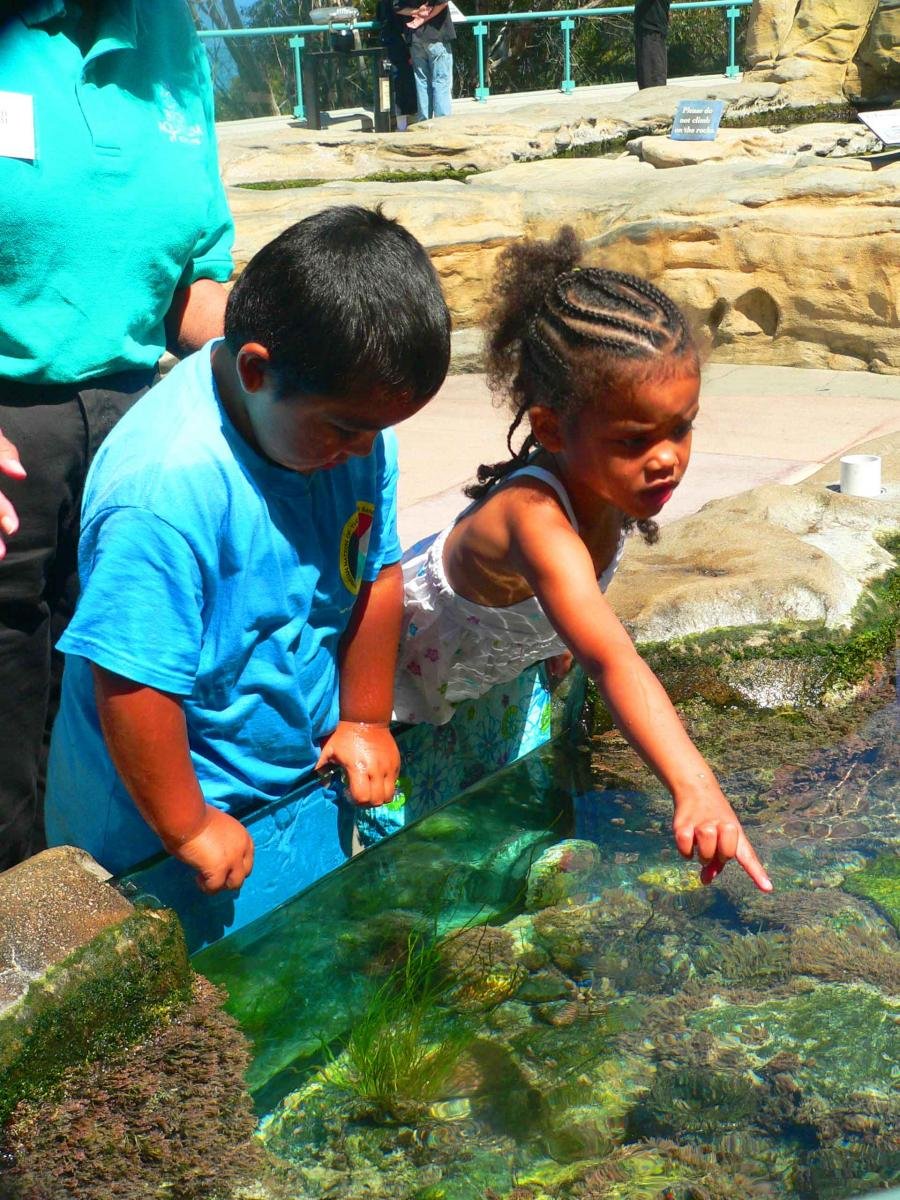 On a patio outside, youngsters touched sea anemones and a sea star described as “sticky” by one child. Four-year-old Kioni Carrizona Lui eagerly peered into a tide pool and focused on catching fish. “They are so fast, it’s really hard!” he exclaimed.