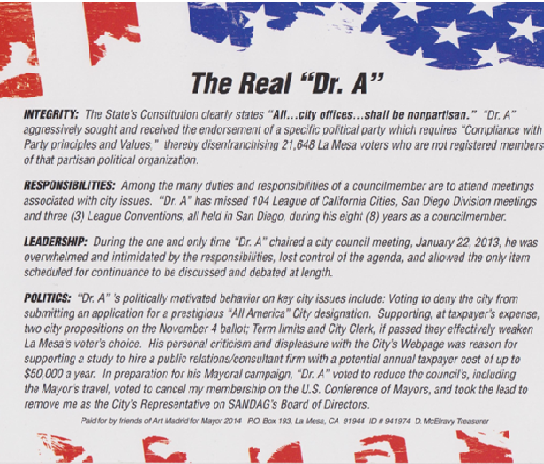 October 22, 2014 (La Mesa)—The campaign for La Mesa’s Mayoral race has turned negative. Mayor Art Madrid’s campaign committee has sent a mailer to voters titled “The Real `Dr. A’ regarding his opponent, Councilman Mark Arapostathis.