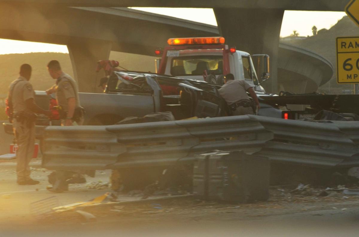 According to the California Highway Patrol website, a silver Chevrolet Silverado struck the center divider and overturned, coming to rest in the number one lane. A grey pickup truck also overturned.