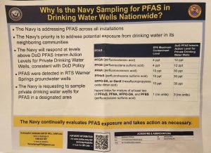 The Navy said if their results show PFAS levels at or above the Department of Defense’s PFAS interim action levels for private drinking wells, the Navy will work with property owners to implement a solution “as soon as possible,” Navy officials told people at the CAL Fire station.