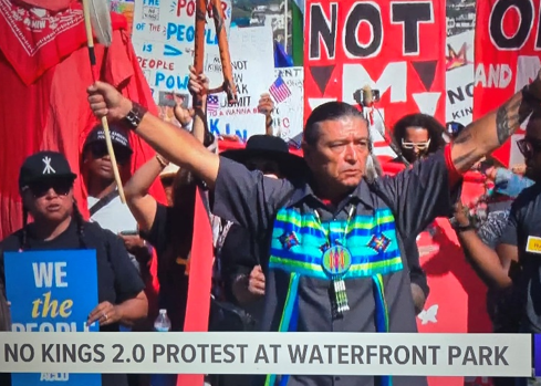 Photo, right: Bobby Wallace, Barona tribal member, speaks at No Kings rally in Waterfront Park.