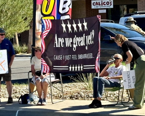 Photo, right by Mitchell Sterling: Borrego Springs seniors in lawn chairs portray sign reading “Are we great yet? Cause I just feel embarrassed.”