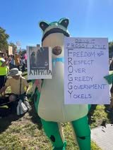 Locally, the mood was festive. Many protesters carried flags or wore patriotic garb. Others dressed in inflatable costumes as frogs, unicorns and other whimsical characters, mimicking Portland, Oregon protesters’ tactic to show that their city is not the “war zone” claimed by President Donald Trump. There were drummers, bagpipers, and a variety of other musicians as well.