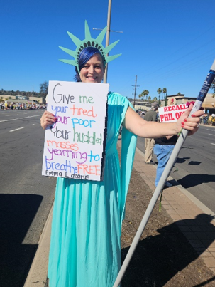 Photo, left by Suzanne Hansen: protester in El Cajon wears statue of liberty costume with sign bearing the statue’s poem welcoming immigrants.