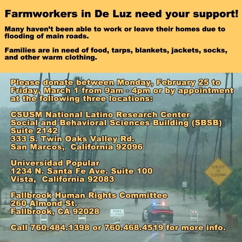Printer-friendly version By Miriam Raftery February 22, 2019 (Fallbrook) – Farmworker families in De Luz/Fallbrook are in “desperate need of emergency supplies” according to a press release