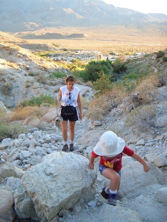 In the desert, always wear sunscreen, hats, and clothes that let your skin breathe and offer some protection from the sun. Be aware of your surroundings, including watching for rattlesnakes and scorpions.