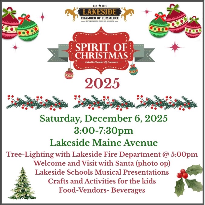 East County News Service Nov. 25, 2025 (Lakeside) — The heart of cozy Lakeside will transform into a hub of festive activity next month, anchored by two of its warmest community traditions: the annual “Spirit of Christmas” celebration and the return of the popular “Mrs. Claus’ Christmas Resale Shoppe.” Sponsored by the Lakeside Chamber […]