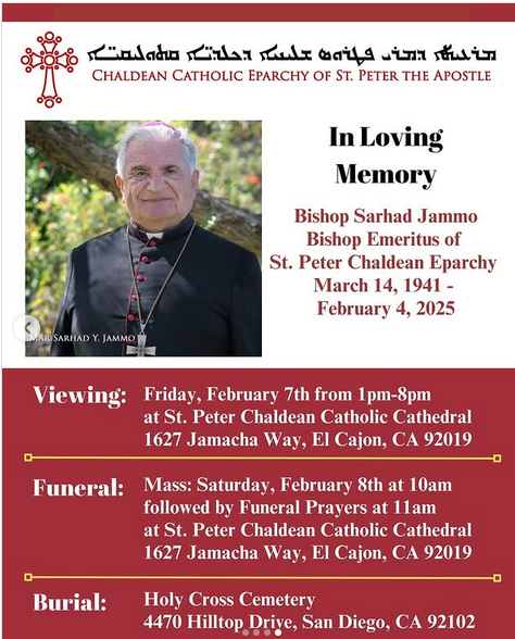The Chaldean Diocese announced on Instagram, “The Eparchy of St. Thomas the Apostle mourns Bishop Sarhad Yawsip Jammo Bishop Mar Sarhad Yawsip Jammo passed from this earthly life and entered eternity on Tuesday, February 4, 2025, in San Diego, California. Let us join in prayer for his soul.”