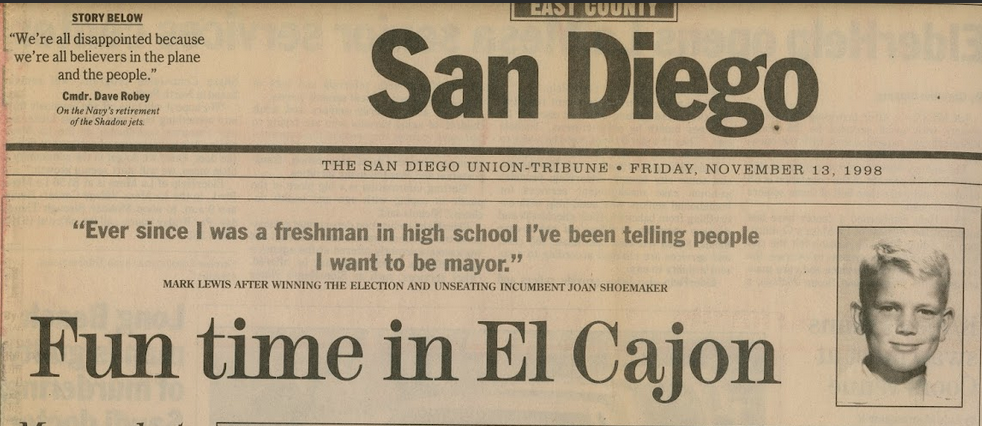 He won election to the city council, serving three terms, or 12 years, before winning election as Mayor in 1998. He ran on a platform that included “bringing fun back to El Cajon,” the San Diego Union-Tribune reported.