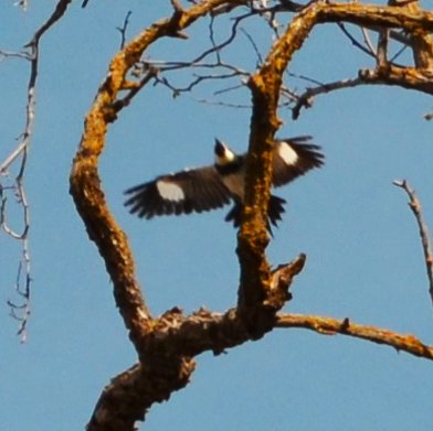Fortunately, our “Bird Talk” columnist Greg Dunne checked with experts and confirmed that this beautiful bird in flight is Acorn Woodpecker.