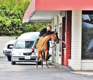 April 3, 2012 (Lakeside) — Pami Wilmers of Lakeside rides her horse, Seth Boy, through the Jack in the Box drive-through in Lakeside. Photographer Billy Ortiz offers this explanation for the unusual jaunt. “Pami will be in the Lakeside Western Days Parade next month, so she rode through town to get Seth Boy used to the cars and noise.”