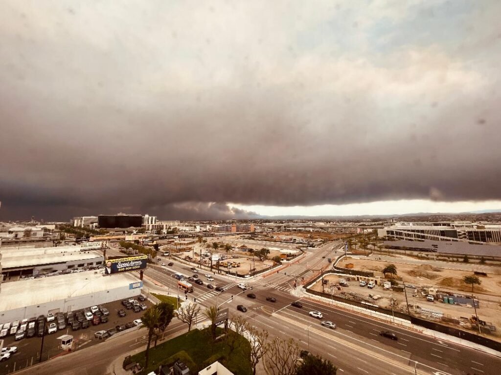 January 8, 2025 (Los Angeles) – No, that’s not a tornado or mother ship descending. Henri Migala snapped this apocalyptic image of the Palisades Fire which is devastating Los Angeles. This photo was taken from the Westin Hotel near Los Angeles International Airport. As of today, the fire has burned 15,832 acres, has destroyed many homes and forced evacuation of some 70,000 residents in several communities including Pacific Palisades, Topanga, Malibu, and Santa Monica. It remains zero percent contained.