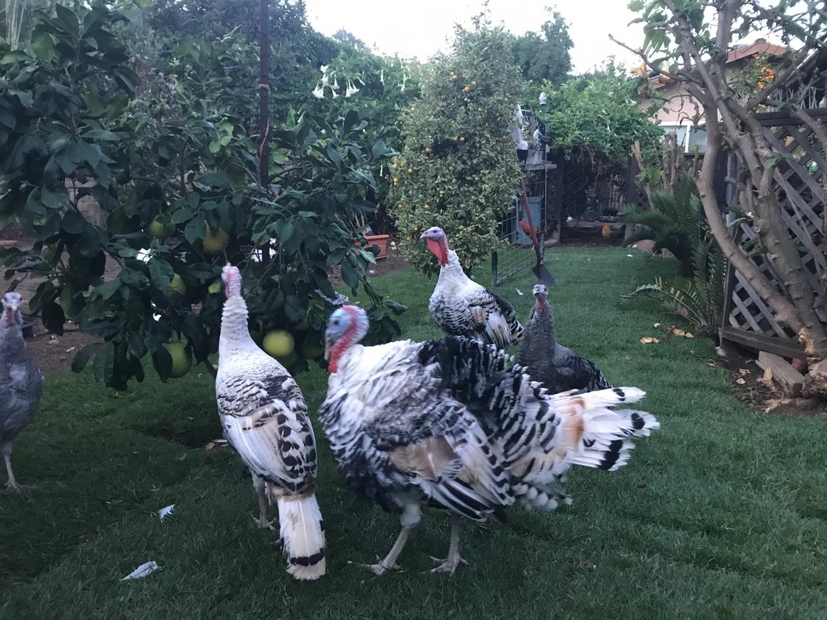 Printer-friendly versionEast County News Service November 23, 2021 (Alpine) – Did you know that not all turkeys are brown? Richard Edwords of Alpine sent this shot of his white “royal palm” and gray “blue slate” turkeys, both heritage breeds. Fortunately for these birds, they won’t wind up on the Thanksgiving table. Edwords says, “They are therapy turkeys. We take them
