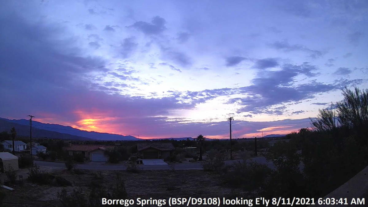 Printer-friendly versionEast County News Service August 20, 2021 (Borrego Springs) – Bob Kutscher snapped this photo on August 11, the morning after a storm dumped three quarters of an inch of rain accompanied by thunder and lightning – all preceded by a Haboob, or dust storm that left particles to intensify the sunrise hues. Printer-friendly version