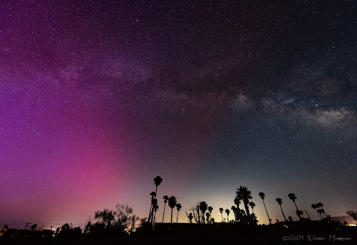 Printer-friendly version By Miriam Raftery Photos by Dennis Mammana May 24, 2024 (Borrego Springs) – Astronomy writer and night sky photographer Dennis Mammana snapped these stunning photos of the Aurora Borealis, or Northern Lights, which made a rare appearance over our region on May 11. The photo, left, taken from his backyard in the Anza-Borrego Desert, also shows the Milky