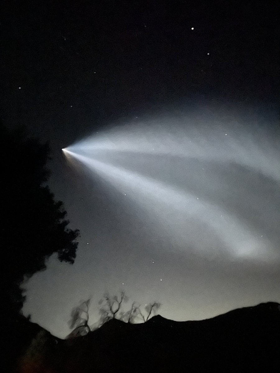 Printer-friendly version July 22, 2023 (Campo) – Mary Simmonds snapped this dramatic image from Campo of a SpaceX rocket launched from Vandenberg Air Force Base on July 19. The Falcon 9 rocket launched 15 Starlink satellites to low-Earth orbit. You can also view video of the rocket taken by Henri Migala at these links: https://youtu.be/1TfQx16gpDs https://youtu.be/CszalLzs5uY Printer-friendly version