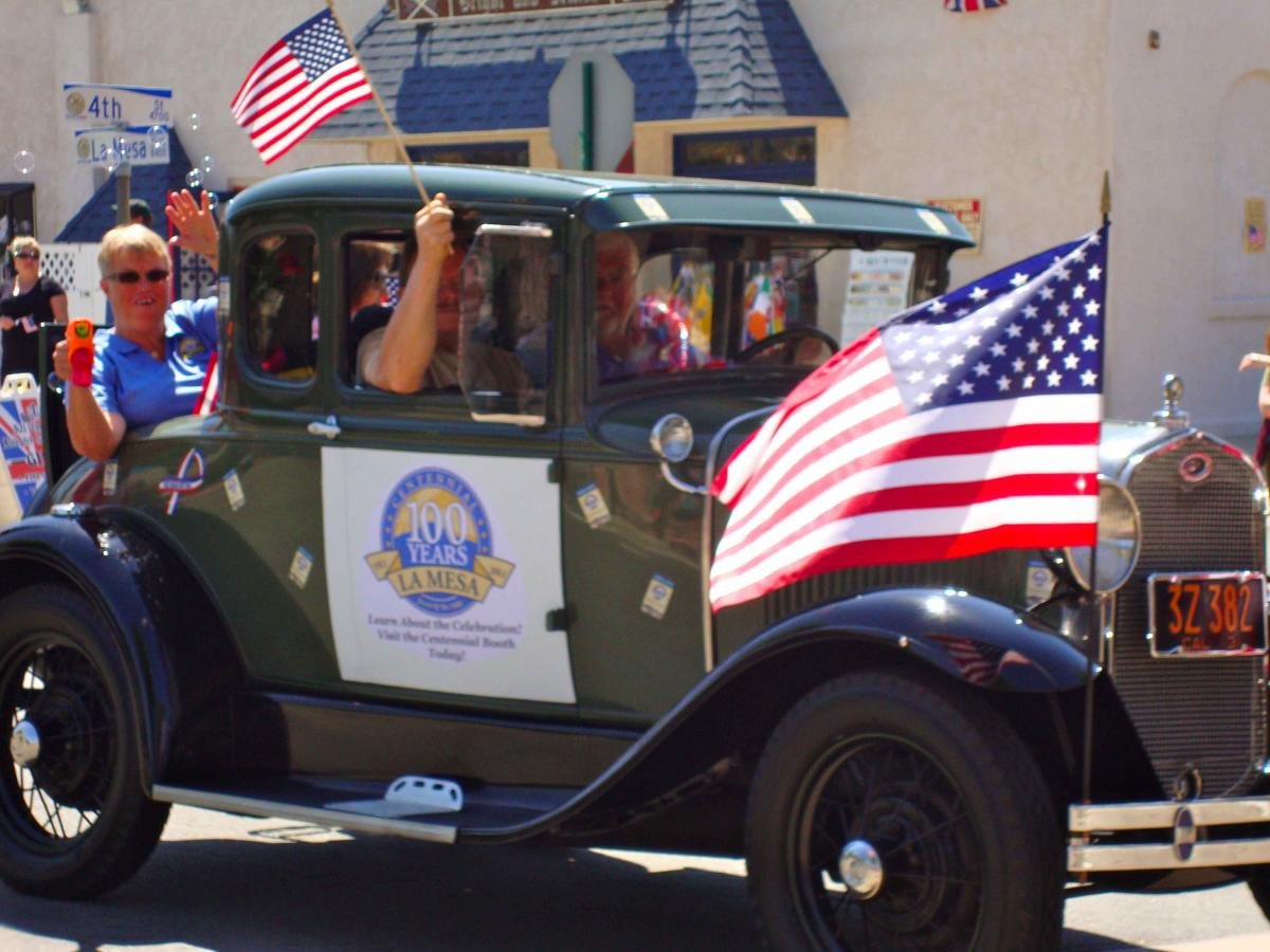 At left, Dexter Levy drives a vintage auto in La Mesa’s Flag Day Parade, heralding in the City’s upcoming Centennial year of celebration. Photo by Kristin Kjaero.