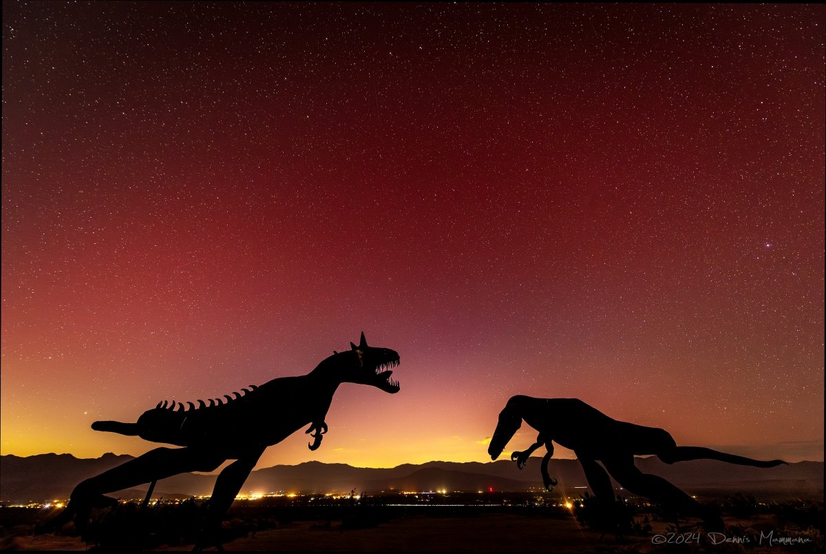 May 24, 2024 (Borrego Springs) – Astronomy writer and night sky photographer Dennis Mammana snapped these stunning photos of the Aurora Borealis, or Northern Lights, which made a rare appearance over our region on May 11. The photo, left, taken from his backyard in the Anza-Borrego Desert, also shows the Milky Way.