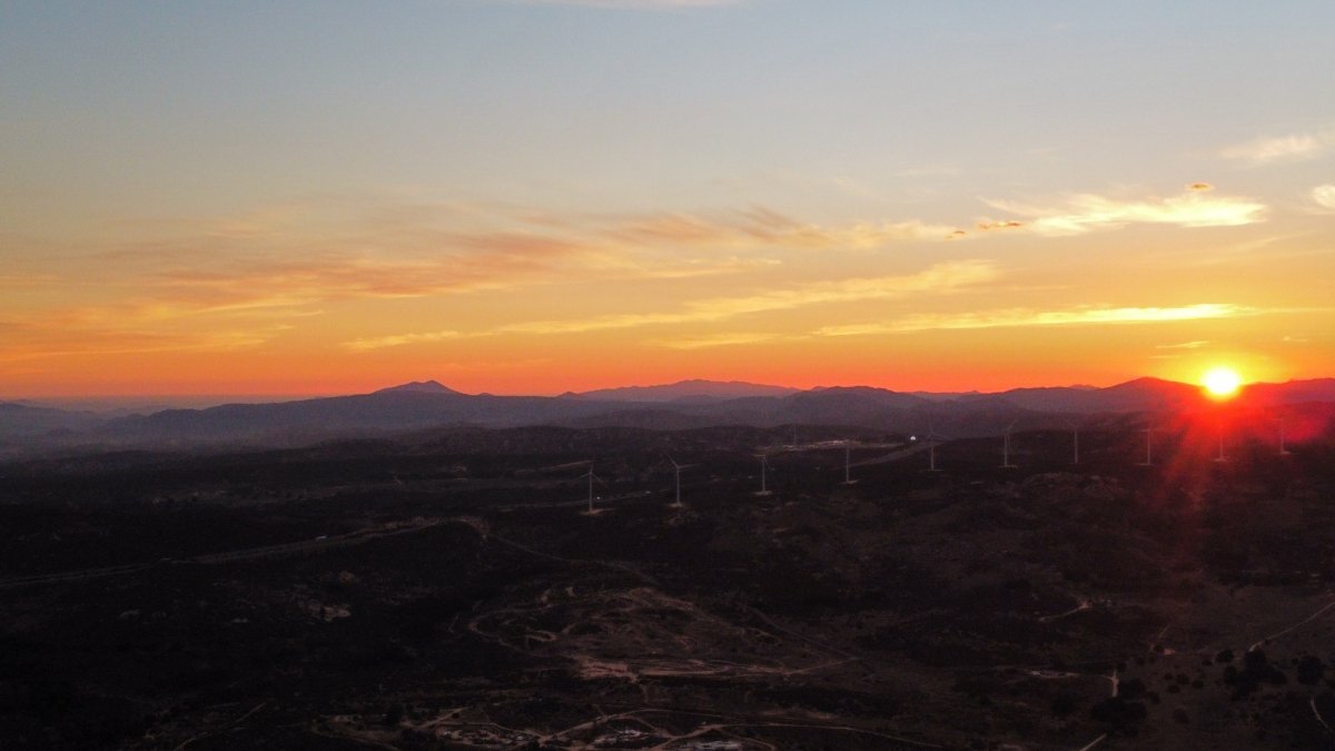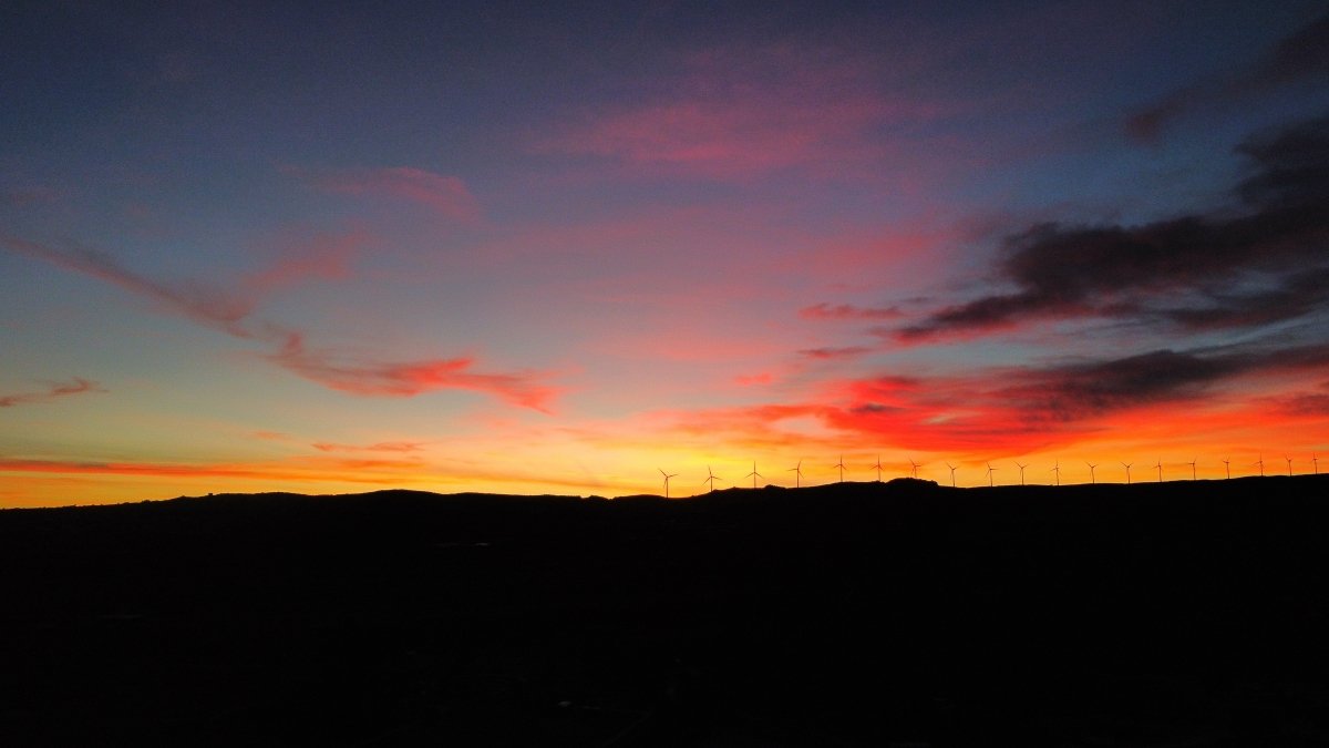 From colorful sunrises to dramatic sunbeams, the photos depict spectacular skies over mountains, rocky terrain, and ridges topped with wind turbines.