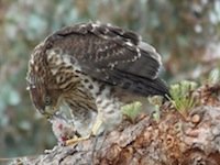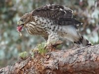 July 1, 2013 (Jamul) – Debbie Ekhaml captured these close-up images of a Cooper’s Hawk family in Jamul, as the fledgling hawks learn how to successfully hunt a sparrow.  Cooper’s Hawks prey on birds and small mammals, even taking on prey larger than themselves such as ducks and chickens.  They have sometimes been known to lose their lives for taking on the wrong prey, such as a large owl.