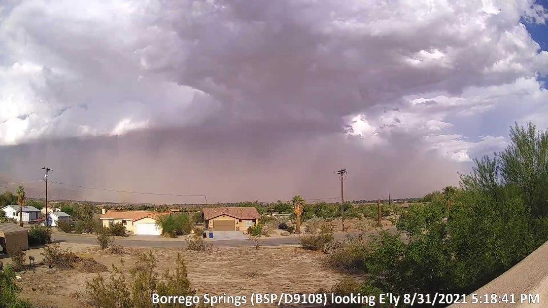 August 31, 2021 (Borrego Springs) – “Strong thunderstorms east of Borrego and subsequent downdrafts has created a Haboob in Borrego Springs, see progression below over several minutes,” says Bob Kutscher, who sent in these photos. A haboob is an intense dust storm carried on an atmospheric gravity current or weather front; haboobs occur commonly in dry land areas around the world.