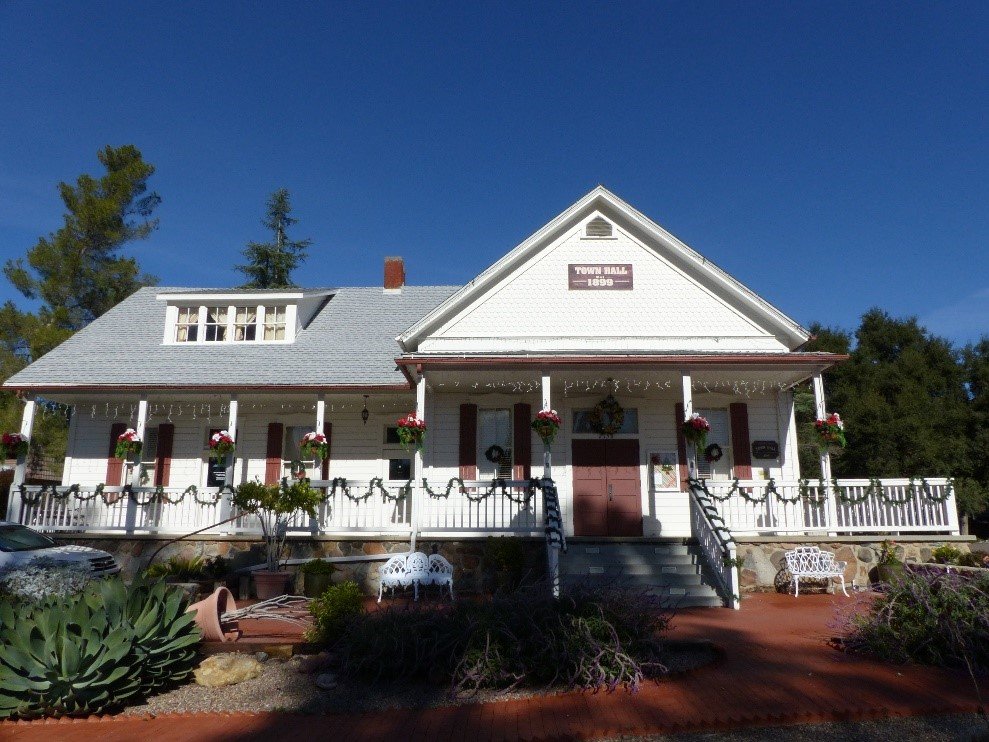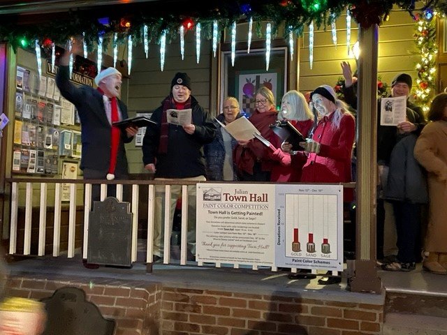 In downtown Julian, carolers sing out good cheer in front of the historic town hall. (Photo, right, by Jeff Holt)