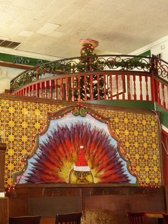Por Favor Mexican restaurant in La Mesa has a sombrero crowning its Christmas tree and a Santa had on a sun mural. (Photo, left, by Miriam Raftery)