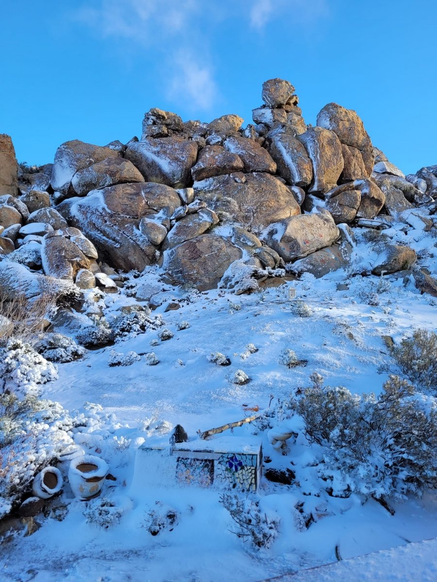 March 2, 2023 (In-Ko-Pah) – Greg Curran sent in these photos of a rare snowfall blanketing In-Ko-Pah in the high desert, near the Desert View Tower and Boulder Park.