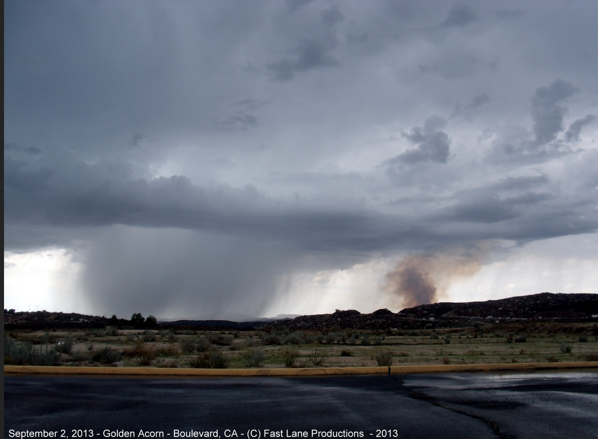 The first shot is taken near the Golden Acorn Casino and shows the incongruous combination of a brush fire (right) in the La Posta area beside the looming stormcell bringing heavy showers to the area. The second (below) is a panorama of multiple cells over the Campo/Boulevard communities, along with the fire.