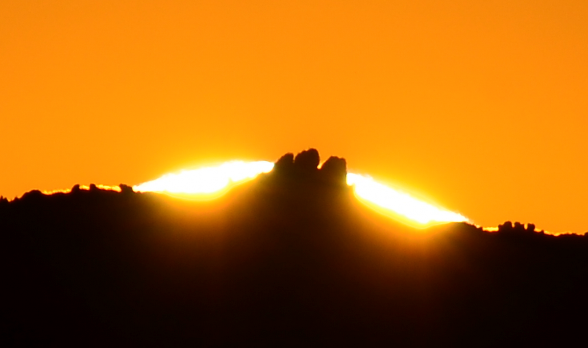 Photo, right: A closer view looking from the east toward Deerhorn Valley shows the three spires and the sun disc split in half on the day of Winter Solstice.