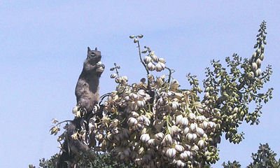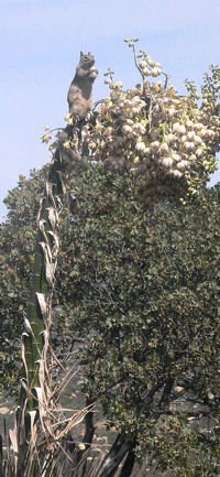 Gophers generally cannot eat the Yucca flowers as the spiny leaves protect the plant,” he observed.  “This one grew up next to a rock pile, and the gopher jumped from the rock pile to the Yucca stalk. The top of the Yucca stalk is deformed–never seen one like that, but it made a nice seat for the gopher.”