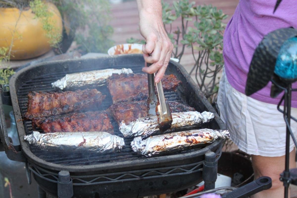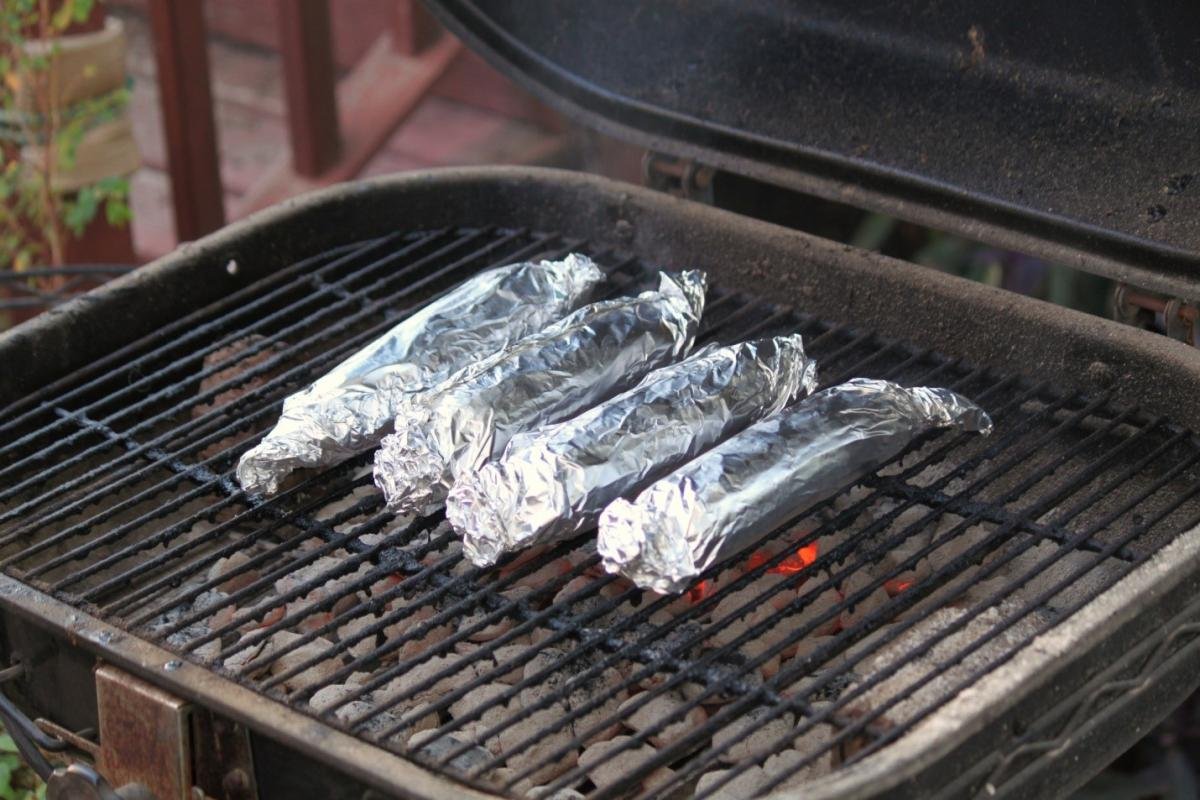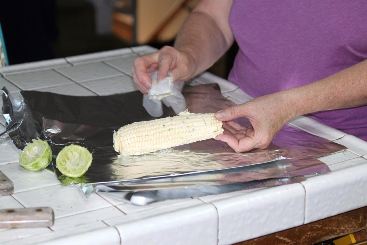 Method for grilling corn in aluminum foil: Starting at the top, strip all the husks and silks away from the ears of corn and discard them. Roll up the corncobs in squares of aluminum foil, twisting the ends to secure, like a candy wrapper. I use a big enough piece of foil to be able to fold it in half for a double layer. Joining the edges horizontally, fold the edges over approximately 1/2-inch and then fold back on itself twice again to adequately seal the corn – this will help keep the moisture from escaping while grilling. Grill alongside your Barbecue meats for 15-20 minutes, turning often.