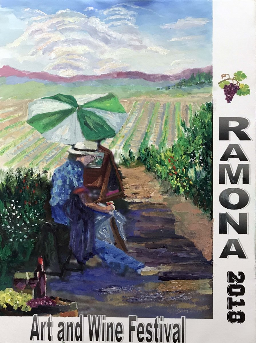 September 13, 2018 (Ramona) – The Ramona Art and Wine Festival selected a painting by Jamie Dougherty, a local artist, for the first commemorative poster to promote the Festival, area artists, and Ramona wine. Jamie, along with Patrick Korch, a painter and sculptor from Poway, was one of two semi-finalists chosen from submissions by participating Festival artists.