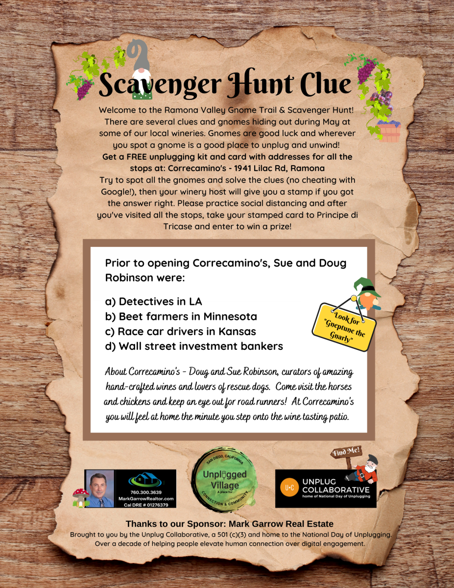 This summer the Unplug Collaborative is helping San Diego become an Unplugged Village and to find the spirit of having fun again. Gnomes have been hiding out during the pandemic just waiting to be discovered. Everywhere you spot a gnome is a good place to unplug and unwind. This May, go on a gnome scavenger hunt with some of the wineries in the Ramona and Escondido valleys!