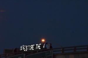 An earlier Restore the Fourth action was also held July 3 at night on the Clairemont bridge over Interstate 5, where 20 or so activists with San Diego Overpass light brigade held up lit littering spelling #RESTORETHE4”, the Twitter hash tag.