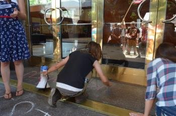 Once the crowd reached Symphony Hall, where Senator Feinstein’s office is located, the guards closed the doors. They refused to have any interaction with the protesters, and the protesters proceeded to read their lists of demands, chalk the entrance to symphony hall, and tape the demands to the door.