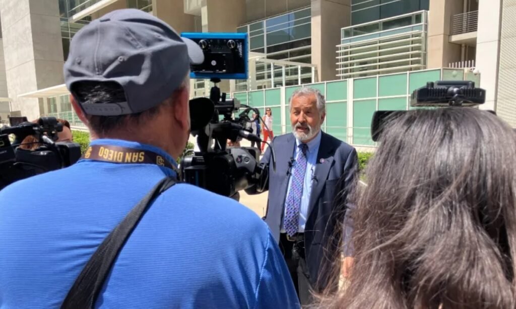 Rep. Juan Vargas speaks to media outside the federal courthouse in downtown San Diego. (Photo by JW August/Times of San Diego)