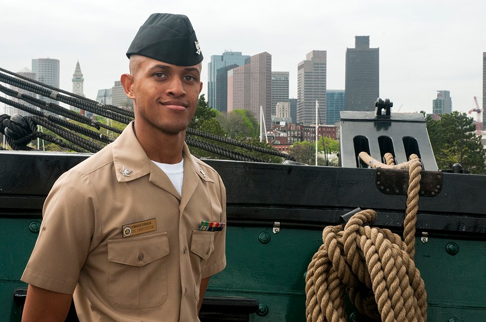 Petty Officer 3rd Class Dominique Robinson, an engineman, serves aboard the 216-year-old Boston-based ship named by President George Washington to honor the Constitution of the United States of America. Famously known as “Old Ironsides,” the Constitution is a wooden-hulled three-masted heavy frigate that originally launched in 1797 as one of six original frigates authorized for construction by the Naval Armament Act of 1794.