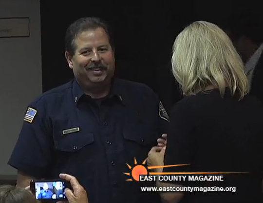 July 13, 2012 (Spring Valley)–By a unanimous vote by the board of the San Miguel Fire District (SMFD) and a badge pinned on his chest, then sealed with a kiss by his wife, former Division Chief Gary D. Croucher was installed as the District’s newest fire chief on Wednesday evening at the board meeting.