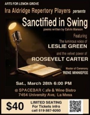 The Ira Aldridge Repertory Players will be presenting “Sanctified in Swing” starting at 7 p.m., Saturday, March 28 at Spacebar Café & Wine Bistro, 7454 University Ave., in La Mesa. Doors open at 6 p.m., organizers say.