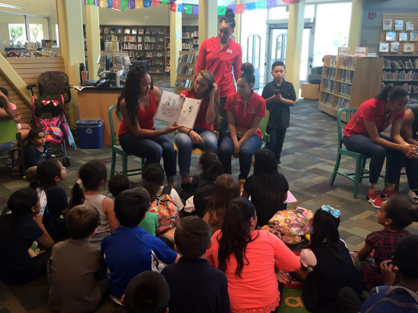 September 30, 2016 (Spring Valley) – San Diego State women’s basketball took part in the Women’s Basketball Coaches’ Association (WBCA) Day of Service on Thurs., Sept. 29 by reading to San Diego-area children at Spring Valley Public Library.