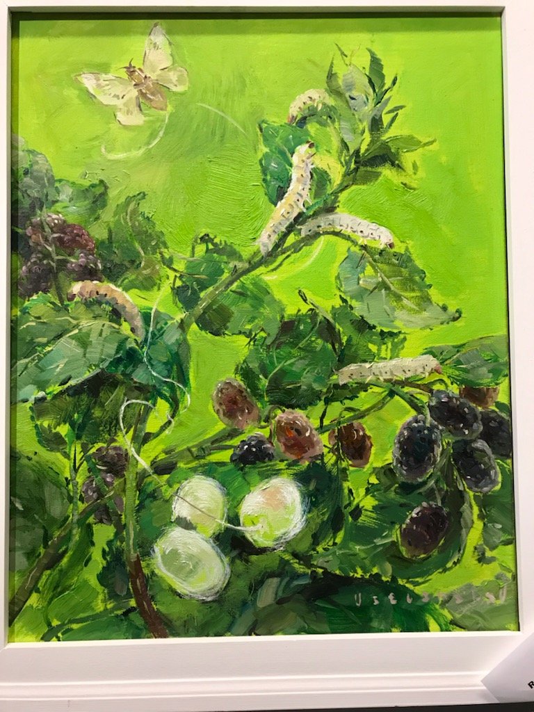 Along with the production of Silkworms, Lamplighters is offering a raffle for the beautiful artwork of Ukrainian artist Vira Ustianska. Vera and her daughter are staying with local playwright Connie Terwilliger until they can return home their war-torn country. Supporting herself with her artUstianska created a piece for the show that serves as program cover.  The raffle of the painting will be held after the final show.