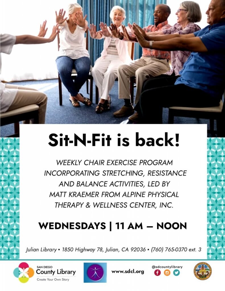 September 23, 2024 (Julian) — Join Matt Kraemer from Alpine Physical Therapy & Wellness Center, Inc., Wednesday mornings from 11 a.m. to noon at Julian Library for a chair exercise program incorporating stretching, resistance, and balance activities.